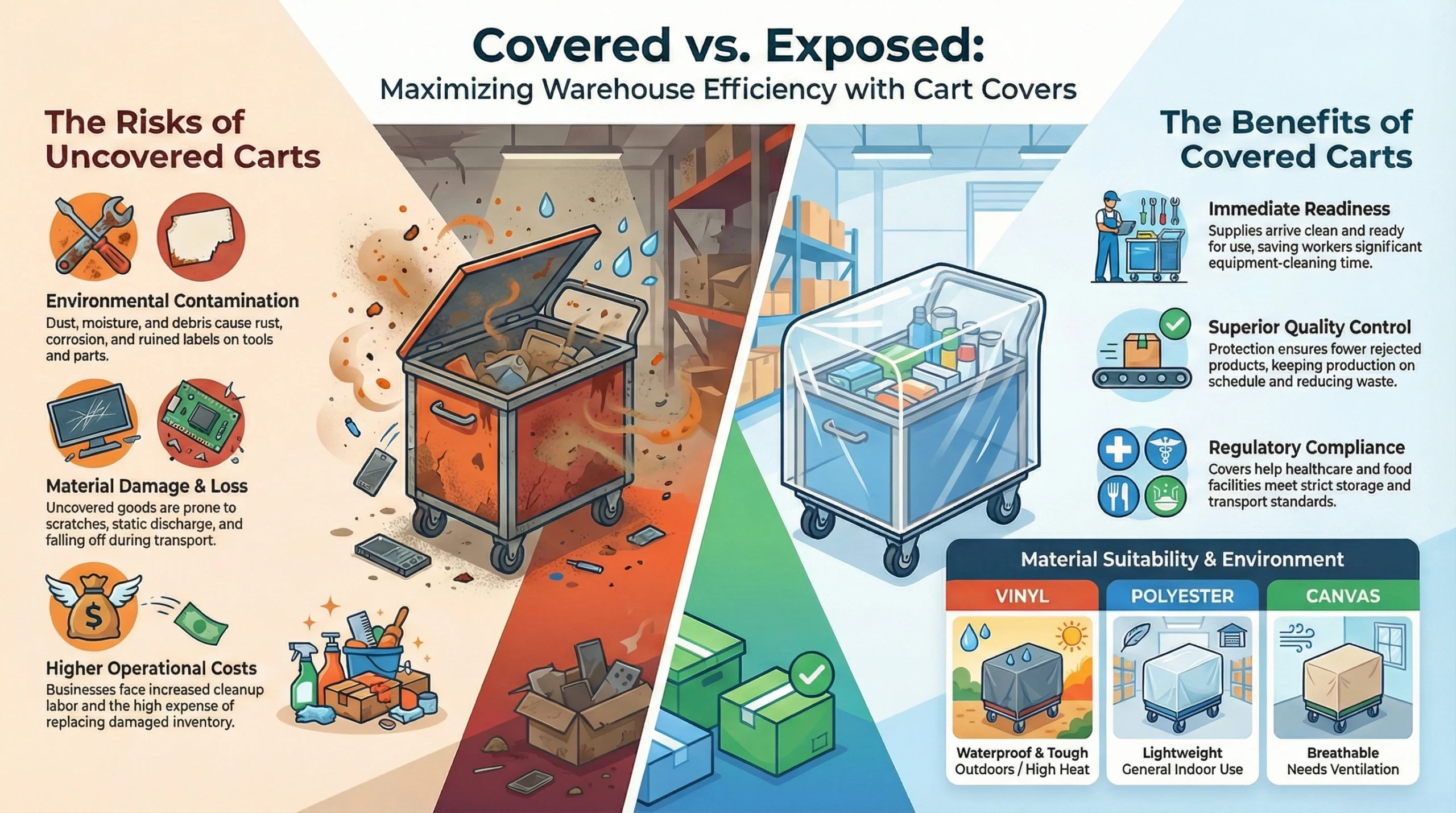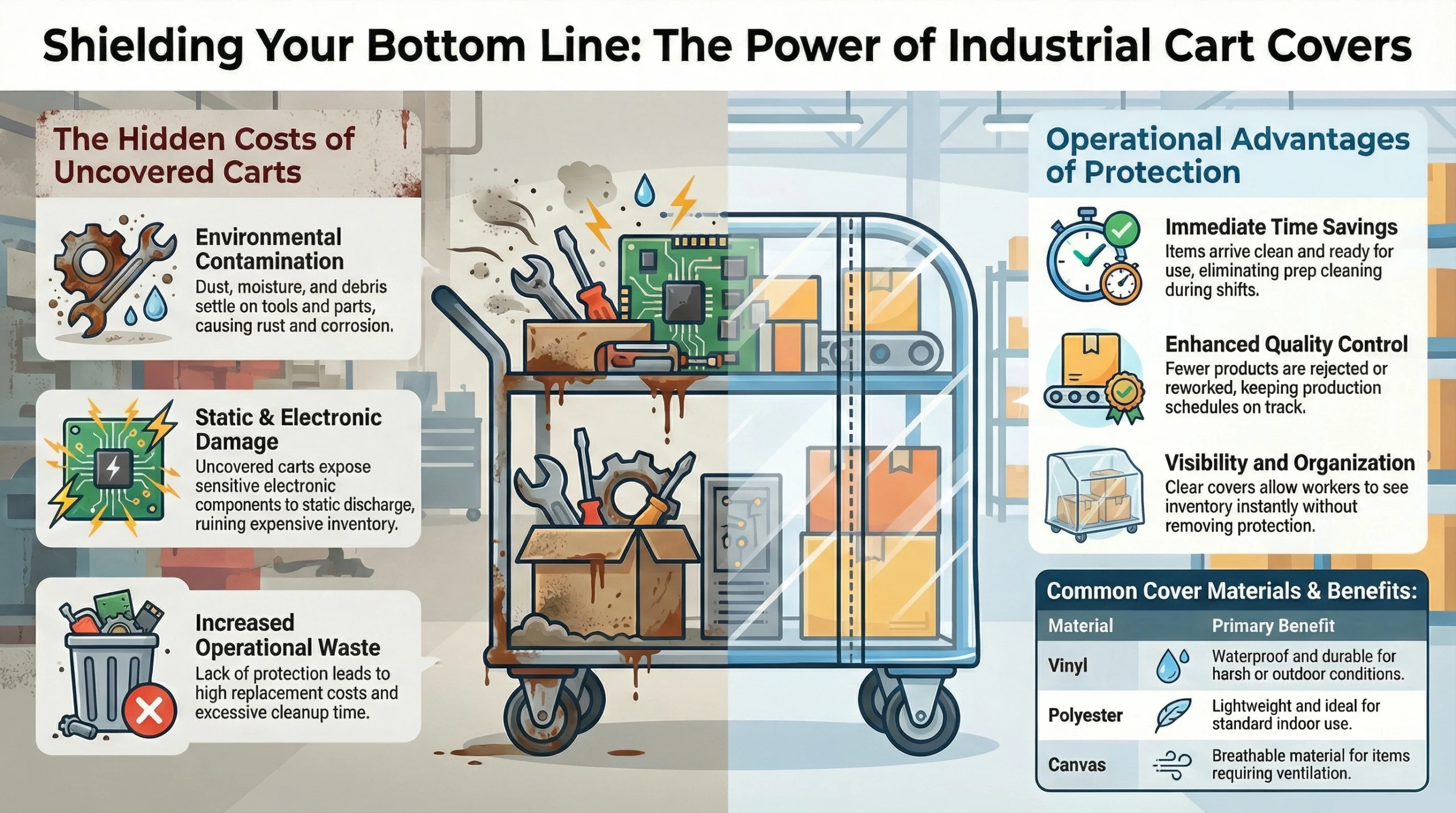 Many warehouses and factories deal with dust, moisture, debris and heavy foot traffic every day. Leaving carts uncovered in these situations creates several problems that add up over time. Some of them are:
